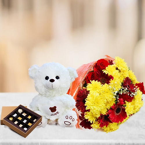 Enchanting and vibrant, this splendid arrangement of fragrant fresh flowers, nestled in lush greens fillers, will make a far more gratifying impression when they arrive with savoury chocolates and a cute huggable bear! This arrangement is handmade using the Following Flowers below: 1 white or Brown Teddy Bear 10 inch Belgian Chocolates 300gm 5 stems of yellow Chrysanthemum 10 stems of Gerbera 2 stems of Gypsophila Green Foliage leaf Hand Tied by our Florist