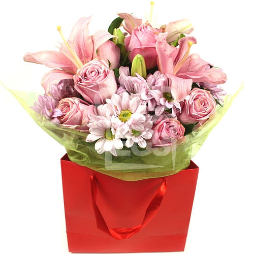 Lush green fillers brimming from the cloud of fresh and fragrant pink buds to get you high on a floral portion of love. Order now and let the love dazzle you in its spell-bound charm. Beautifully arranged in a Gift Bag this flower bouquet also features: 2 Stems of Pink Lily 6 Stems of Pink Gerbera 4 Stems of Pink Chrysanthemum 4 Stems of Pink Rose 2 Stems of Gypsophila