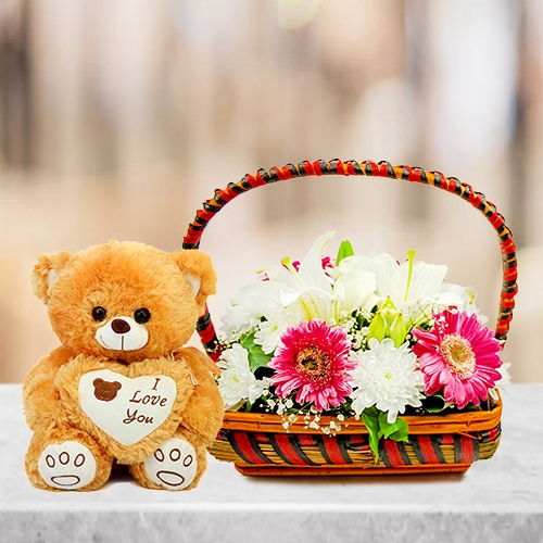 Glowing with the warmth of rich pink and white flowers, this bouquet reflects your pure and soulful sentiments. Order now and spread the joy. Beautifully arranged in a Gift Basket this flower bouquet also features: 1 Teddy Bear Brown or White Color 10 inches 1 Stem of White Lily 4 Stems of Gerberas 1 Stems of Chrysanthemum 2 Stems of Gypsophila