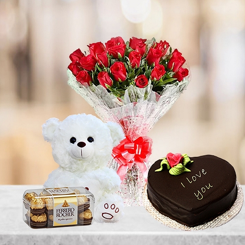 4Lb heart shaped Cake with 24 Fresh Red Roses, 200gm Ferrero Rocher Chocolate and Teddy Bear(8" - 10") with free greeting card and free delivery.