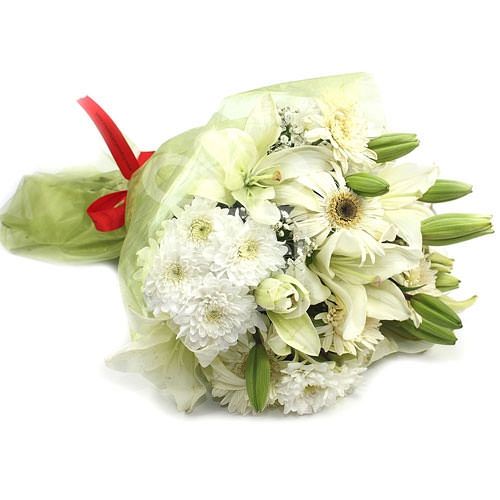 The subtlety and delicacy of white pearl-like buds to renew your soul with a calm scent of fresh Lilies. Graciously arranged with white lilies, chrysanthemum and white gypsophila, the lovely bouquet truly adds an aura of peace, innocence and harmony to your room. This arrangement is handmade using the Following Flowers below: 6 Stems of White Lilies 5 Stems of White Chrysanthemum, 3 Stems of White Gypsophila Green Foliage leaf Hand Tied by our Florist