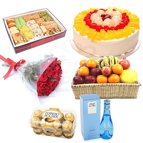 Large Bunch of Red roses with 4Lb Cake and 200gm Ferrero Rocher, Cool Water 100ML of your choice, 7-9KG Fruit standard Basket and 2KG Mix Mithai.