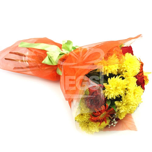 Classically rich and delightfully fragrant, this awesome bouquet of yellow and orange Gerberas and Chrysanthemum flowers is like a living sweet dream. Being a perfect gift for your loved ones, it creates a peppy and bustling aura. This arrangement is handmade using the Following Flowers below: 6 stems of Chrysanthemums 6 Stems of Red Roses 4 Stems of Gerberas 2 stems of Gypsophila Green Foliage leaf Hand Tied by our Florist
