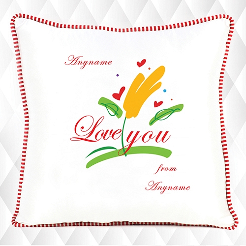 It is a fresh looking cushion with white front and back panels and contrast piping gives this cushion a distinctive look. Dimensions: 14 x 14 inches Finished Detail: Piped Cover, Removable Zipped Cover Material:Imported Fabric Filling: Cushion pad is filled with Polyester fiber Balls How can you customise this cushion? The cushion is personalised with name of the sender and the receiver printed on the front side. Delivery of this cushion is available to all major cities of Pakistan, and require 2-3 working days notice to be delivered on your requisite date. Please Contact Customer Support team for more Information
