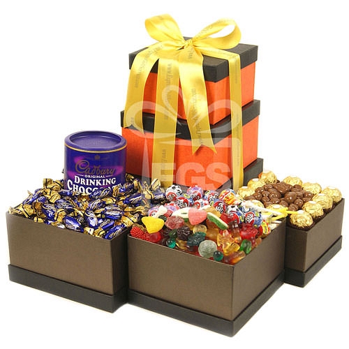Surprise the loved one like a dream come true….. the heavenly delicious sweets comes in a huge quantity would definitely makes a pampering warm wish from your side. The mouthwatering lollipops, candies, choco pop and chocolates make this gift tower a true indulgence indeed. The boxes Include: Cadbury Eclair 460gm Cadbury drinking chocolate 500gm 35 x Assorted Lollypops Assorted jellies 250gm Fererro Rocher 200gm KitKat pop Choc 280gm Features: Items are packaged in stylish Gift Boxs stacked together to make a Tower. Finished with a Hand-tied Satin Rabin