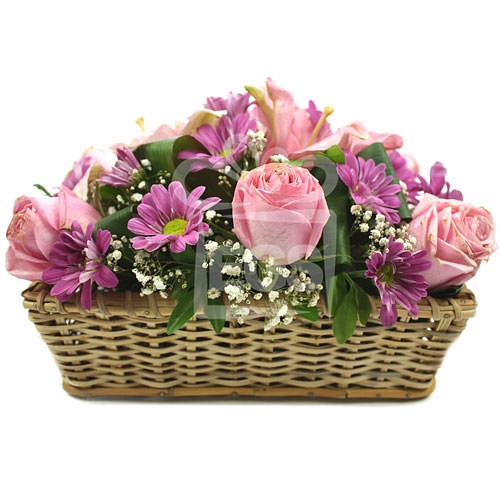 Nothing can replace the elated feelings of happiness and excitement like a basket of shimmering pink flowers to brighten your special recipient’s day. This arrangement is handmade using the Following Flowers below: 6 Stems of Pink Roses 1 Stem of Pink lily 2 Stems of Chrysanthemum 2 Stems of Gypsophila