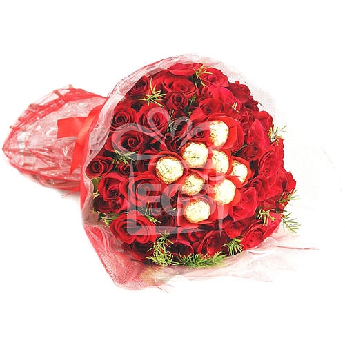 Want to surprise someone with a lavish treat? Here we bring you a gregarious collection of Red Roses all assembled together with the tempting Ferrero Rochers chocolates. You cannot beat the lovely desires with anything but this splendid gift for your loved one. He/ She would be pleased to receive such a lavish gift with so much warmth in it. This fabulous flower bouquet consists of: 60 Stems of Red Roses 8 - 10 Ferrero Rochers Hand Tied by our Florist