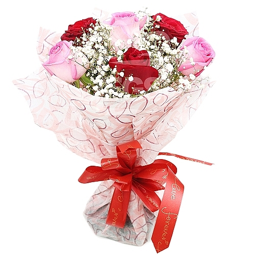 This magnificent Bouquet make your day bloom. Featuring premium flowers hand-tied and finished with gift wrap and ribbon.It is without doubt a truly breathtaking way to show someone how much you love them. This arrangement is handmade using the Following Flowers below: 3- Red Roses 3- Pink Roses 4- Gypsophila Pink Imported Paper + Transparent Cellophane + Ribbon Depending on availability components such as wrapping AND greenery design may vary.