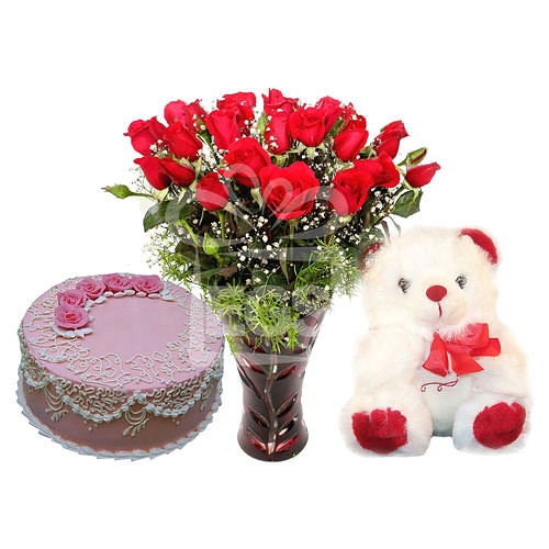 24 red roses, 2lbs Cake from Redolence Bakers, and Teddy Bear with free message card and free delivery. Vase can be purchased separately.