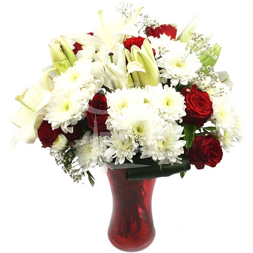 Roses speak louder than words. Imagine the impression they’ll make when mingled with fresh and fragrant white lilies to cheer up the entire aura of your room. Why wait? Send the bouquet and wish them a little rose-full a little lily- full day of joy. This arrangement is handmade using the Following Flowers below: 4 Stems of White Lily 8 Stems of Red Rose 4 Stems of Chrysanthemum 3 Stems of Gypsophila Green Foliage leaf Hand Tied by our Florist