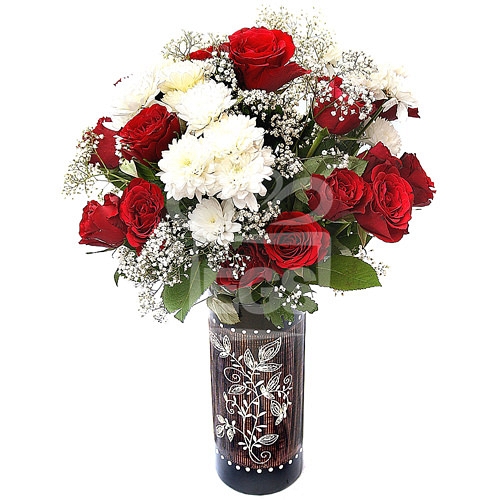 Exquisite and ethereal, yet classically elegant and splendid, this medley of ravishing red and soothing white flowers is a timelessly heartfelt and thoughtful gift presented in a well-decorated vase. This arrangement is handmade using the Following Flowers below: 24 Stems of Imported Red Roses 4 Stems of White Chrysanthemums Green Foliage leaf Hand Tied Bouquet by our expert florist Vase not included. You can add one in the next step.