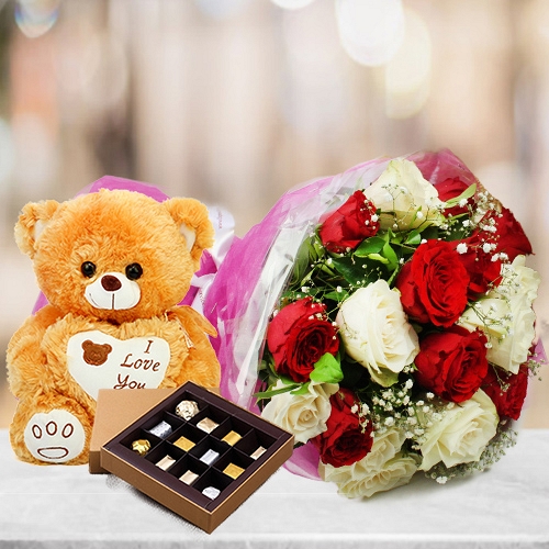 An extraordinary collection of splendid red and white roses, a bundle of toothsome chocolates and a cuddly teddy bear is surely an enticing way to show your love and care. Gift this rose bouquet - that'll surely melt a heart. This arrangement is handmade using the Following Flowers below: Brown or White Color Teddy Bear 10 inch Belgian Chocolate Box 300gm 12 Stems of White Roses 12 Stems of Red Roses 2 Stems of White Gypsophila Green Foliage leaf Hand Tied by our Florist