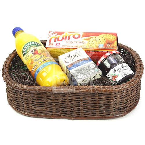 Wonderful gifts for those who will enjoy reminisce down our classic refreshing breakfast memory lane. Send it for a perfact day start Hamper Contains: Robinsons “Orange” soft drink 1 litre Bonne Maman fruit jam 370 gm Nutro digestive Biscuits 400 gm Choice Black Tea 32g(16 tea bags) Comes in Handmade cane Basket With Personalised Message card Elegantly Gift wrapped with Ribbon.
