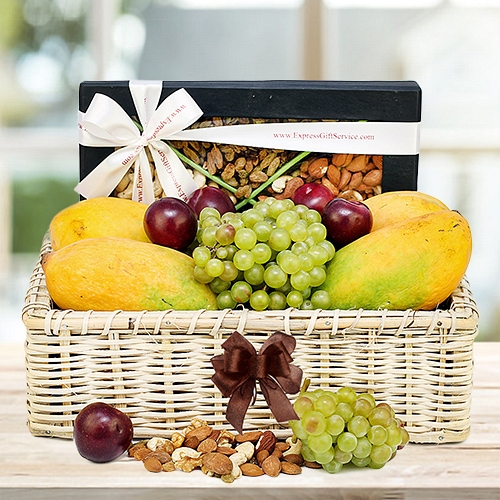 Let the hamper do the talking. Whoever the recipient, they're sure to be overwhelmed with this beauty. The ideal centre-piece for any family celebration. Send it for a family treat. Hamper Contains: Approximately 4 Kg Mix Seasonal Fruits including Mangoes Plum Grapes 1 Kg mix Dry Fruits Packed in a beautiful Box Including Almond Cashew nuts Walnuts Raisins Comes in Handmade cane Basket With Free message card containing your Personalised Message inside it and Elegantly Gift wrapped with Ribbon.