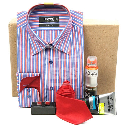 Make someone’s day more special with the surprise of this awesome gift delivery to their door step. This hamper contains everything from shirt, tie, and cufflinks to deodorant and face wash. Hamper Contains: Uniworth Shirt Loreal Deodorant for men (Invincible) 150 ml Loreal Face Wash for men(Charcoal Black Foam) 100ml Cufflinks Tie Comes in a Brown Box Elegantly Gift wrapped with Ribbon and a Personalised Message card.