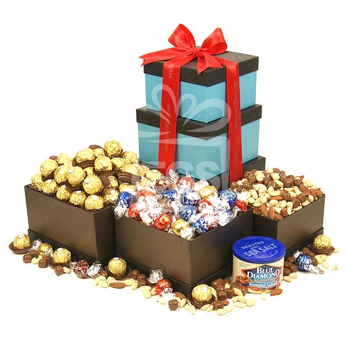 Saying thank you can be a bit difficult but this pampering gift would make the job much easier. Show your sincere thanks and appreciation for a favor or a gesture with this gift tower loaded with nuts chocolates. This hamper can also be sent on any occasion for building a great impression of taste and selection. The Boxes Include: Fererro Rocher 600gm Assorted Lindt 400gm Roasted Almonds/Nuts 170gm Mix Dry fruits 200gm 2 x Nestle Kitkat Pop Choc 140gm Features: Items are packaged in stylish Gift Boxs stacked together to make a Tower. Finished with a Hand-tied Satin Rabin