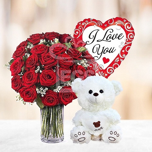 The most amazing feeling in the world deserves to be expressed in an amazing way too. Delight the love of your life in a way she will remember for decade this combo is a wonderful combination that will remind him/her of your love every time he/she use it. Contains: 24 Imported Red Roses stem Bouquet 8-10 inches Teddy Bear