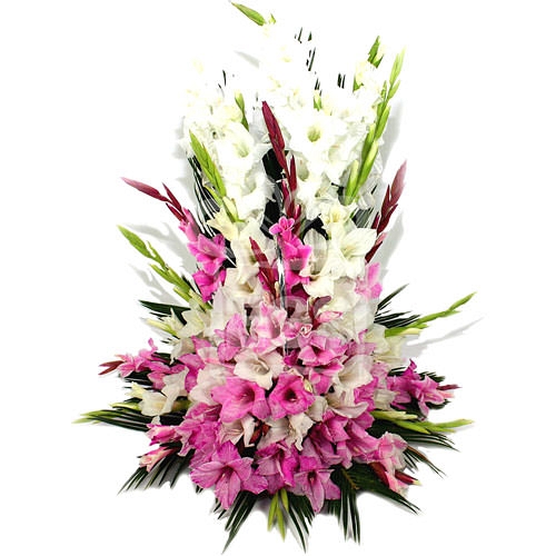 A beautiful basket of white and pink gladiolus that makes a great impression of love and care. Contains: 36 White and Pink Gladiolus